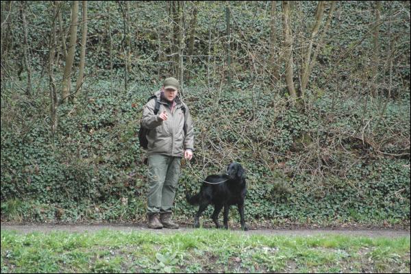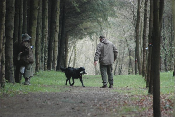Blind/Verleitungs-Mark - Es ging für das Team einen gerade Waldweg entlang zum Richtergespann. Rechts lichter Laubwald, links dichter Nadelwald. Der Hund sollte ein Blind in ca. 60-70 meter Entfernung geradeaus auf dem Waldweg arbeiten. Auf etwa der hälfte des Rückwegs wurde vor dem Hund ein Verleitungsdummy quer über den Weg vom Laubwald in den dichten Nadelwald geworfen (mit Schrotschuss). Der Hund hatte zuerst zum Führer zu kommen um das gearbeitete Blind abzugeben und wurde anschliessend auf das Mark im Nadelwald geschickt.