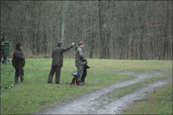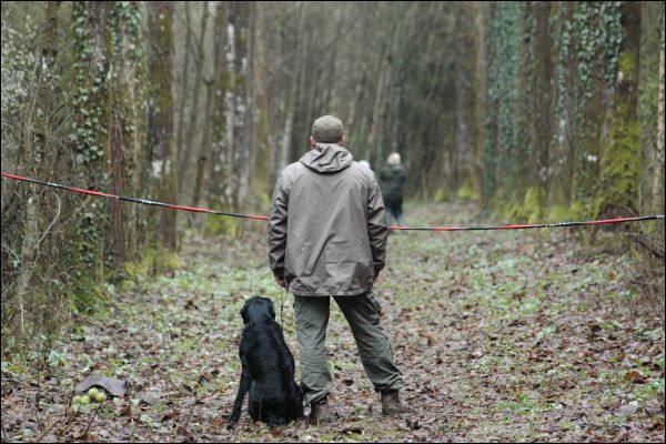 Mark - Hund und Führer gingen einen Weg hoch, wo der Richter nebst Helfer standen. Dort wurde das Team nach rechts ausgerichtet (ableinen). In einem Waldstück ca. 40-50 m entfernt standen Schütze und Werfer. Der Wald war dort sehr dicht bewachsen und am Boden war jede Menge Totholz Sträucher und Büsche; auf dem Weg in den Wald gab es noch einen Graben. Nach dem Schuss wurde das Dummy in sehr dichten Bewuchs geworfen. Die Flugbahn war nur im ersten Drittel sichtbar.