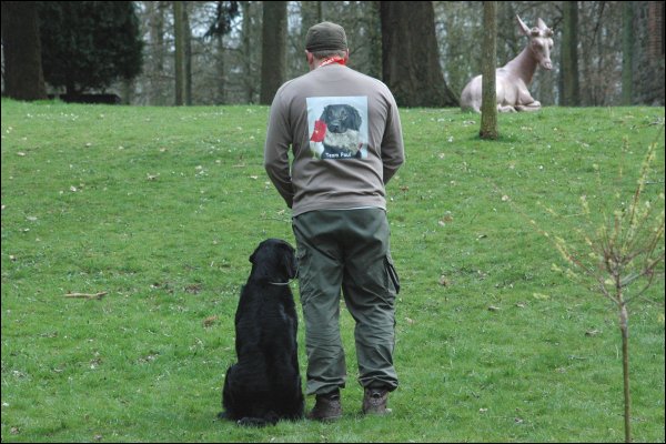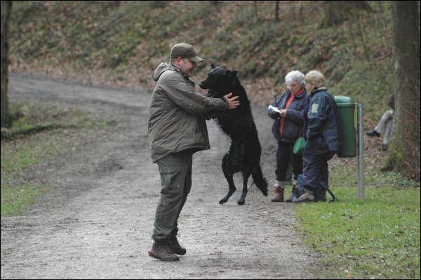 Die Sache mit dem Dummy und dem Wasser - Nachdem wir in letzter Zeit an der Steadyness am Wasser gearbeitet hatten eigentlich kein Problem...eigentlich. Normalerweise überbrückt Paul am Wasser die ersten 3-4 Meter mit einem gewaltigen Hechtsprung mit anschliessendem Bauchplatscher. Jetzt eierte er den Hang hinunter und sah mich am Ufer angekommen mit grossen Augen fragend an. Geistig sah ich schon meine Schuhsohle auf seinem Hintern um ihm den nötigen "Ansporn" zu vermitteln, besann mich aber eines Besseren und wiederholte das Kommando mit Fingerzeig in Richtung Dummy. Geht doch...er kam dann auch sauber am Einstieg wieder raus und übergab mir ohne Schütteleien oben angekommen das Dummy...14 Punkte.
