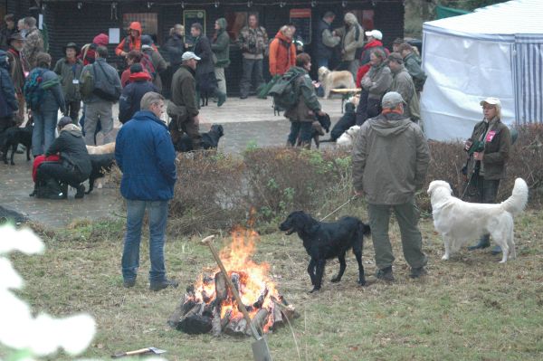 Wir meldeten uns also bei den WT-Organisatoren an...Startnummer 13....hmmm.... ein Omen? Mal schaun. Bis zur Einteilung der Gruppen wärmten wir uns am grossen Lagerfeuer auf, dass die Veranstalter gemacht hatten. Eine sehr gute Idee wie wir finden, vor allem bei den Witterungsbedingungen. Nach einiger Zeit wurden die "Schnupperer" also dann zur ersten Aufgabe an Station 4 geschickt. Die 16 Gespanne setzen sich also in Bewegung und wir erreichten einen abgetrennten Bereich direkt am Waldrand. Wir waren wegen Pauls Leistung beim WT sehr gespannt, da er in den letzten Wochen/Monaten so gut wie nur mit Wild gearbeitet und schon länger kein Dummy mehr gesehen hatte. Die Aufgabe war freie Fussfolge mit anschliessender Markierung. Frank ging also mit Paule los...sah ja ganz gut aus..stopp und sitz...auch gut...Schuss, Dummy fällt..."Apport" Paul lief los, blieb am Dummy stehen und schaute Frank für den Bruchteil einer Sekunde an mit einem Blick, der hätte sagen können "das hier Herrchen? Bist Du sicher? Keine Kaninchen oder Ente? Na gut...ich hols Dir". Paul nimmt also das Dummy auf, parkt ein und gibt ab. Alles bestens; uns fiel ein Stein vom Herzen.
