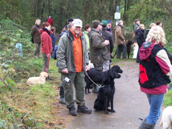 Inzwischen schon gut durchgeweicht ging es dann zur zweiten Station. Dort wurden die Schnupperer an der Leine etwa 20 meter geführt, unter Bäumen fiel dass ein Schuss und ein Dummy flog. Bei Fuss entfernten sich die Gespanne dann wieder zur Ausgangsposition und die Hunde wurden geschickt. Wieder super. Der Spruch von der Richterin ("ganz schön steady für 'nen Flat") liess Frank dann etwas die Augen verdrehen.Diese "Flat-Sprüche" hassen wir mittlerweile wie die Pest, auch wenn sie lieb gemeint sind.