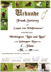 Dann wurden wir aufgerufen und es kam einer dieser Momente, wo man sich in den Allerwertesten beissen könnte, dass man das nicht auf Videokamera festhalten konnte. Pauls Startnummer wurde aufgerufen, Frank schnallt ab. Irgendwann fällt dann der Schuss und das Dummy direkt am Rande des Abhangs in die Talsperre. Eingesprungen war er schonmal nicht, obwohl er mal kurz gezuckt hatte. Das Kommando kam und Paul startete wie von der Tarantel gestochen los. Mit einem Seemannsköpper wirft er sich in Richtung Dummy; im Vorbeischliddern auf der nassen Wiese greift er sich dann noch das Dummy in den Fang und kommt ein paar Meter weiter hinten mit einer einwandfreien Gesässbremse kurz vor vom Abhang zum See dann doch noch zum stoppen. Die "Reifen" drehen durch und sobald er wieder etwas grip unter den Hufen hat kommt er im Schweinsgalopp zurück zu Frank und übergibts das Dummy vernünftig. Puh...wir sind durch und haben unseren allerersten Einsatz bei einem Workingtest in unseren Augen erfolgreich hinter uns gebracht, zumal Paul nach längerer "Dummyloser" Zeit seine Sache sehr gut gemacht hatte.