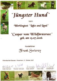 Die ersten 6 wurden dann aufgerufen. Als wir bis zum Platz drei noch nicht dran waren dachten wir schon es wäre nix mit einer Platzierung. Als Detlef dann beim Verlesen von Platz 1 sagte "jetzt wird's kompliziert beim Aussprechen des Namens" hat Frank Schnappatmung bekommen und musste behutsam nach vorne geleitet werden. Platz 1 von 16 Gespannen mit 96/100 Punkten bei unserem allerersten Working Test....wir hatten die Tränen in den Augen und waren unendlich stolz auf Paul, zumal Frank dann später nochmal nach vorne gerufen wurde und die Urkunde und den Preis für den jüngsten Hund des Teilnehmerfeldes entgegennehmen durfte.