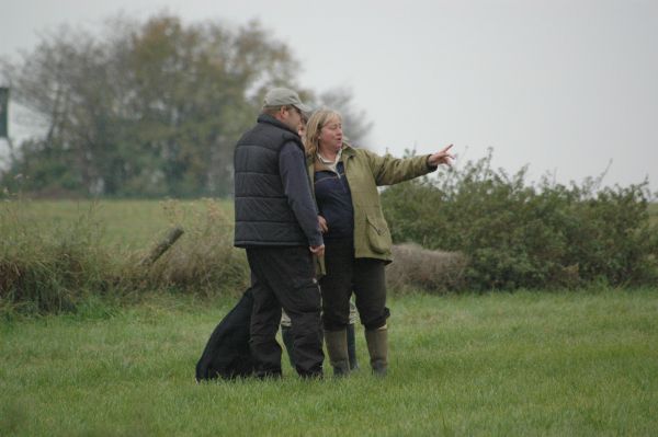 Dann gings prompt weiter zur Station von John Greeves (A4). Die Aufgabe dort war vom Aufbau her ähnlich wie die vorherige. Diesmal ging es jedoch bergauf und die 2 Markierungen wurden nach rechts und links vom Team geworfen. Der Richter entschied dann, welche Markierung der HF und welche der Hund arbeiten durfte (in dieser Reihenfolge). Frank hatte diesmal besser markiert, Paul nicht ;-)