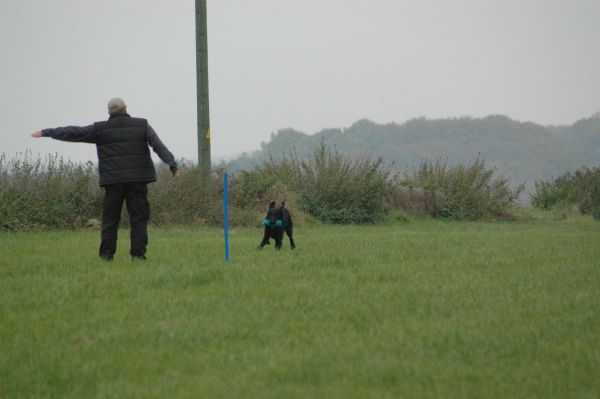 Die Schwierigkeit aus unserer Sicht an dieser Aufgabe war der Stopp-Pfiff und die Steadyness bei der Markierung über den Hund drüber. Obwohl Frank arge Zweifel hatte meisterte Paul diese Aufgabe einwandfrei und erhielt dafür 19 Punkte (20 Punkte sind bei englischen Richtern scheinbar ein grosses Tabu).