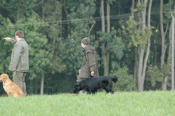 Bei Ally Mc Gregor (A3) wurde zunächst die Steadyness getestet. Es wurde eine weite Markierung hangabwärts am Waldrand (sehr schwer zu sehen) und eine in ca. 10 meter Entfernung rechts von Paul und Frank geworfen. Die erste Markierung durfte auf Kommando des Richters dann der Hundeführer arbeiten (Frank hatte extrem schlecht markiert). Wieder bei Paul angekommen durfte dieser dann die weite Markierung arbeiten. Hier ist er zwar in die richtige Richtung gespurtet, aber da er das Dummy nicht sofort fand ist er dann nach rechts abgedriftet. Er hatte dann aber super den Stopp-Pfiff und das zurück nach links einweisen super angenommen und das Dummy dann auch sofort gefunden (16 P.).